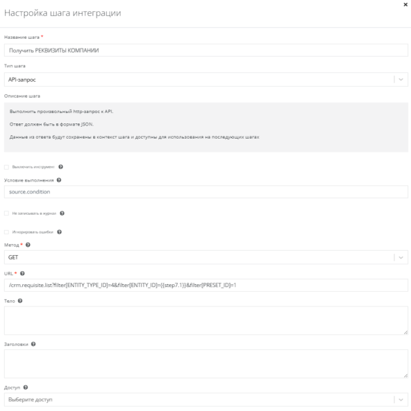 Используем API-запрос, метод - GET. Укажем URL /crm.requisite.list?filter[ENTITY_TYPE_ID]=4&filter[ENTITY_ID]={{step7.1}}&filter[PRESET_ID]=1.