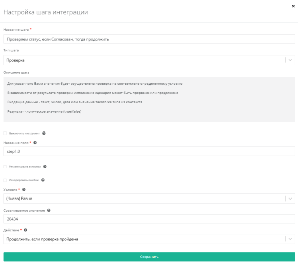 Используем проверку по полю step1.0. Условие - Число равно, сравниваемое значение - 20434, Действие - продолжить, если проверка пройдена.