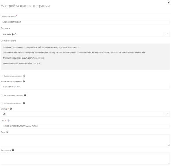 Используем инструмент Скачать файл. Это также будет запрос методом GET, URL - {{step13.result.DOWNLOAD_URL}}.