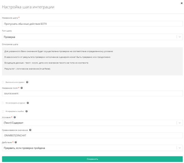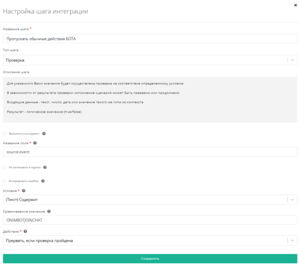 Используем инструмент проверки по полю source.event. Условие - Текст(Содержит). Сравниваемое значение - ONIMBOTJOINCHAT, Действие - Прервать, если проверка пройдена.
