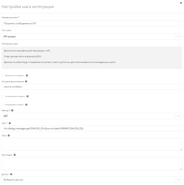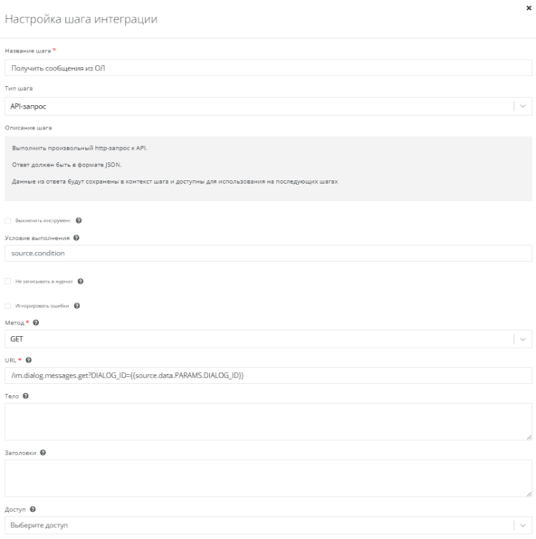 Делаем API-запрос методом GET с указанием URL - /im.dialog.messages.get?DIALOG_ID={{source.data.PARAMS.DIALOG_ID}}.