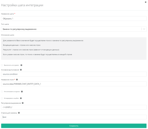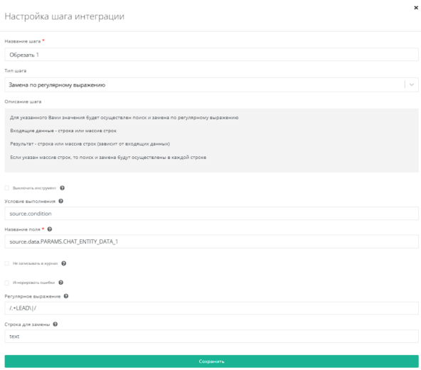 Используем инструмент Замена по регулярному выражению в поле source.data.PARAMS.CHAT_ENTITY_DATA_1. Регулярное выражение - /.+LEAD\|/.