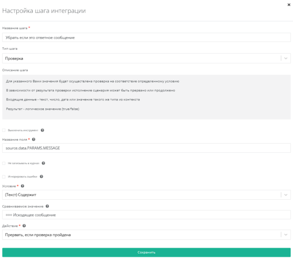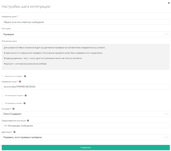 Также используем проверку, но уже в поле source.data.PARAMS.MESSAGE. Условие - Текст(содержит), Сравниваемое значение - === Исходящее сообщение, Действие - прервать, если проверка пройдена.