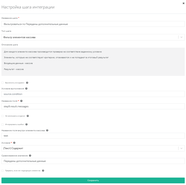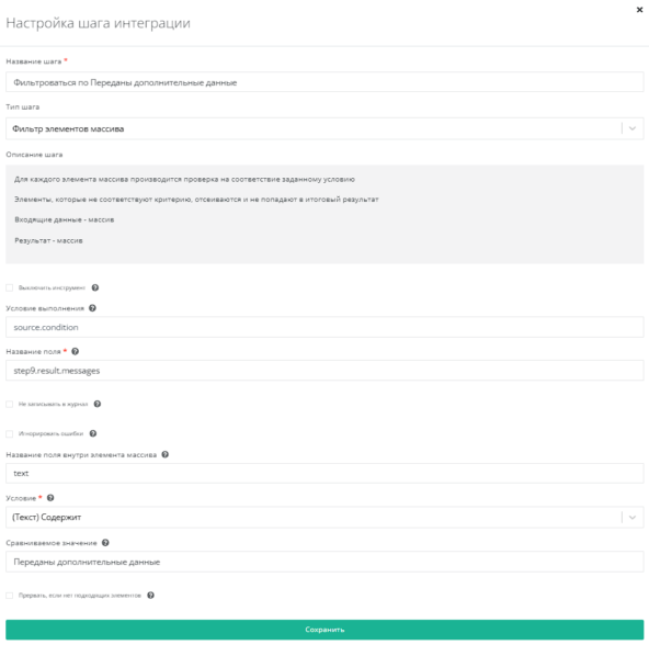 Используем инструмент Фильтр элементов массива по полю step9.result.messages. Условие - (Текст)Содержит, Сравниваемое значение - Переданы дополнительные данные.