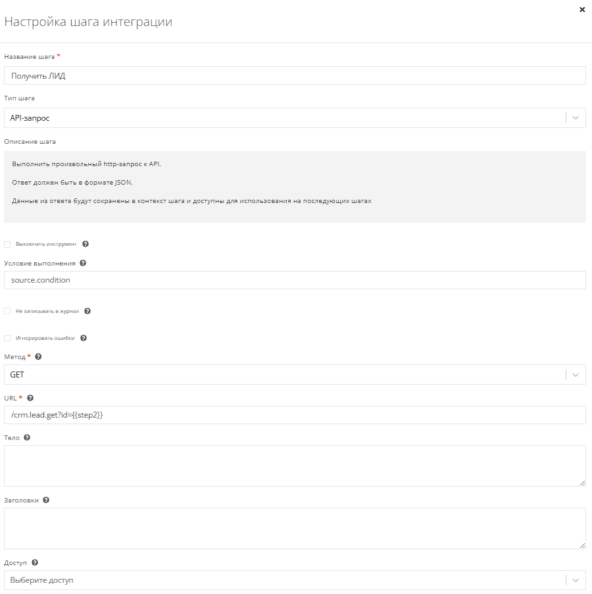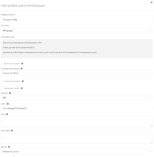 Делаем API-запрос методом GET с указанием URL - /crm.lead.get?id={{step2}}.