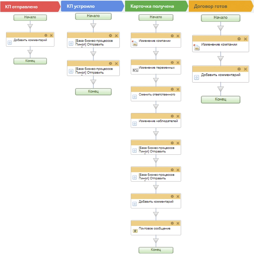 Проблема клиента заключалась в отсутствии единого автоматизированного процесса движения Сделки. Его и необходимо было настроить.
