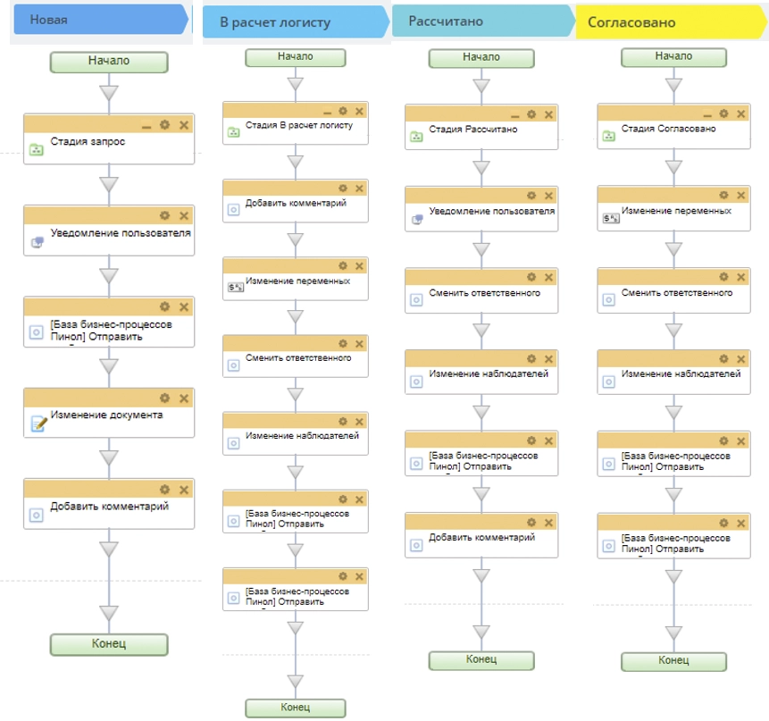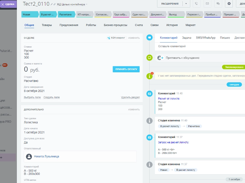 Требовалось автоматизировать процесс движения Сделки по 5-ти направлениям: авто-логистика, авиа-логистика, сборка авто/ЖД, море, ЖД целые контейнеры. Необходимо было, чтобы на каждой стадии был свой ответственный менеджер и наблюдатель, выставлялись задания для менеджера, выводились расчетные данные от логиста.