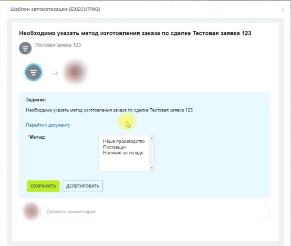 По условию бизнес-процесса, после формирования сделки, ответственному менеджеру приходит задание от бизнес-процесса, в котором сказано, что «Необходимо указать метод изготовления заказа по сделке».