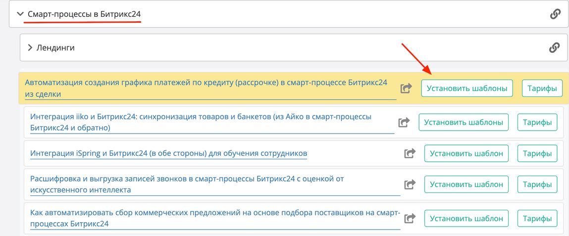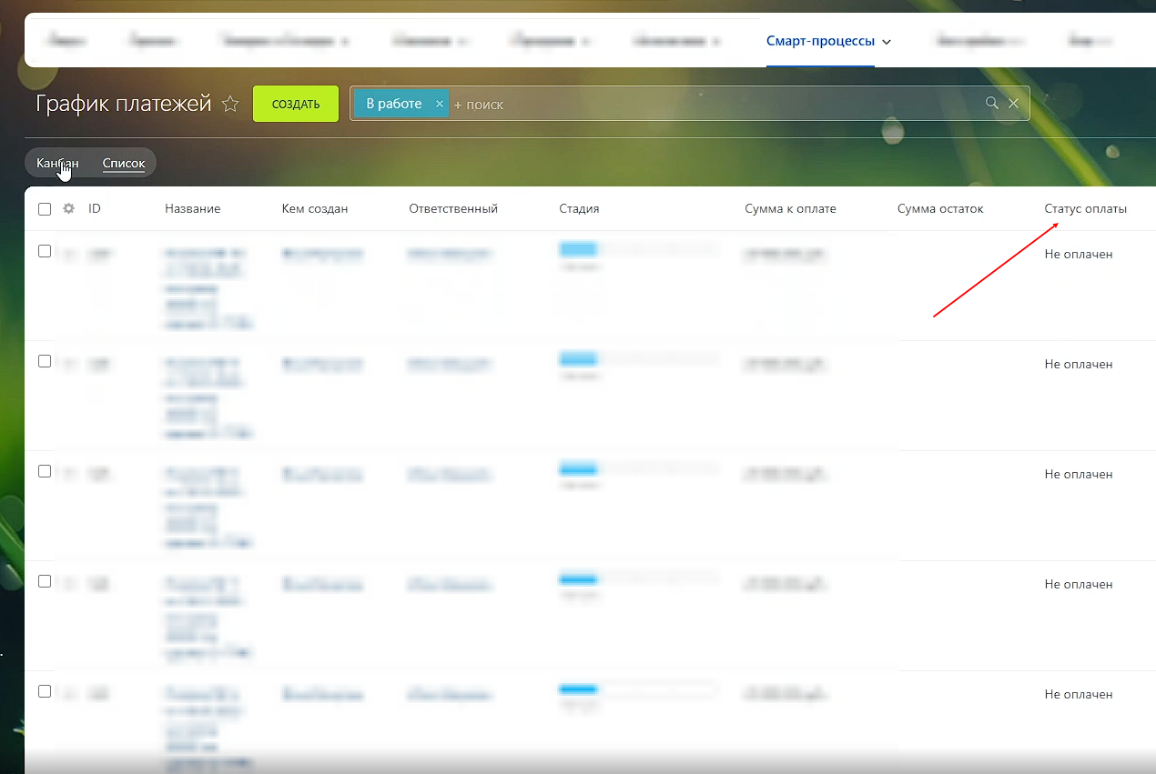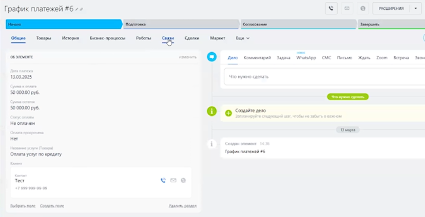 - Автоматическое создание записей в графике платежей внутри отдельного смарт-процесса для каждой сделки.