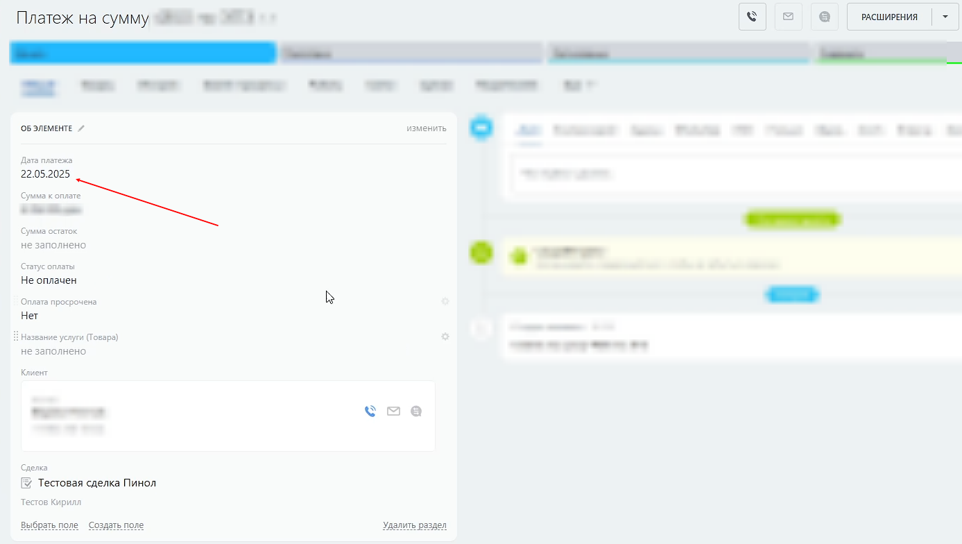 В карточке сделки появляется вкладка «График платежей», где автоматически создается необходимое количество платежей, исходя из указанного числа.