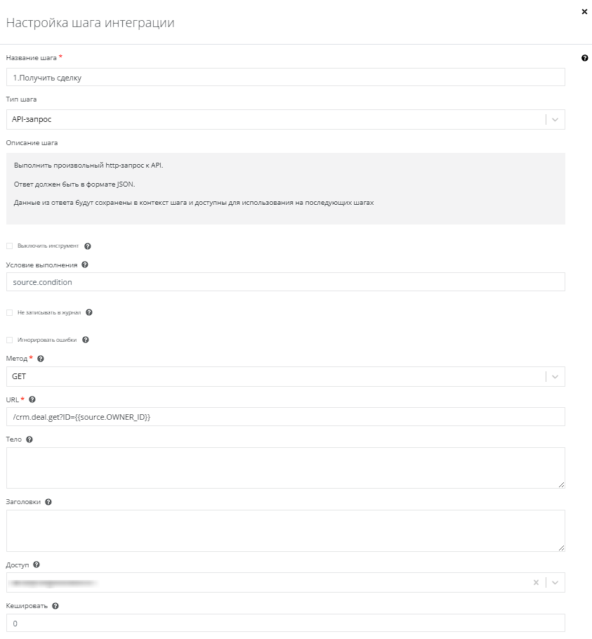 Используем API-запрос методом GET. Укажем URL = /crm.deal.get?ID={{source.OWNER_ID}}.