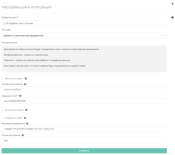Используем замену по регулярному выражению в поле source.DESCRIPTION (это описание задачи). Регулярное выражение - /