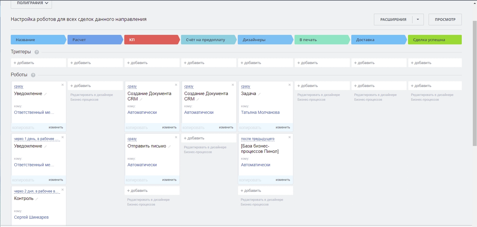 В сделках для направления “Полиграфия” настроены многочисленные роботы с уведомлениями/контролями/задачами, главной особенностью данного направления является автоматическое формирование коммерческого предложения и отправка его клиенту, уведомление в персональный чат менеджера, если он ответственный за сделку.