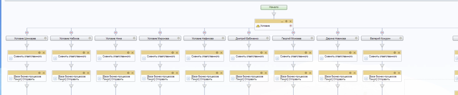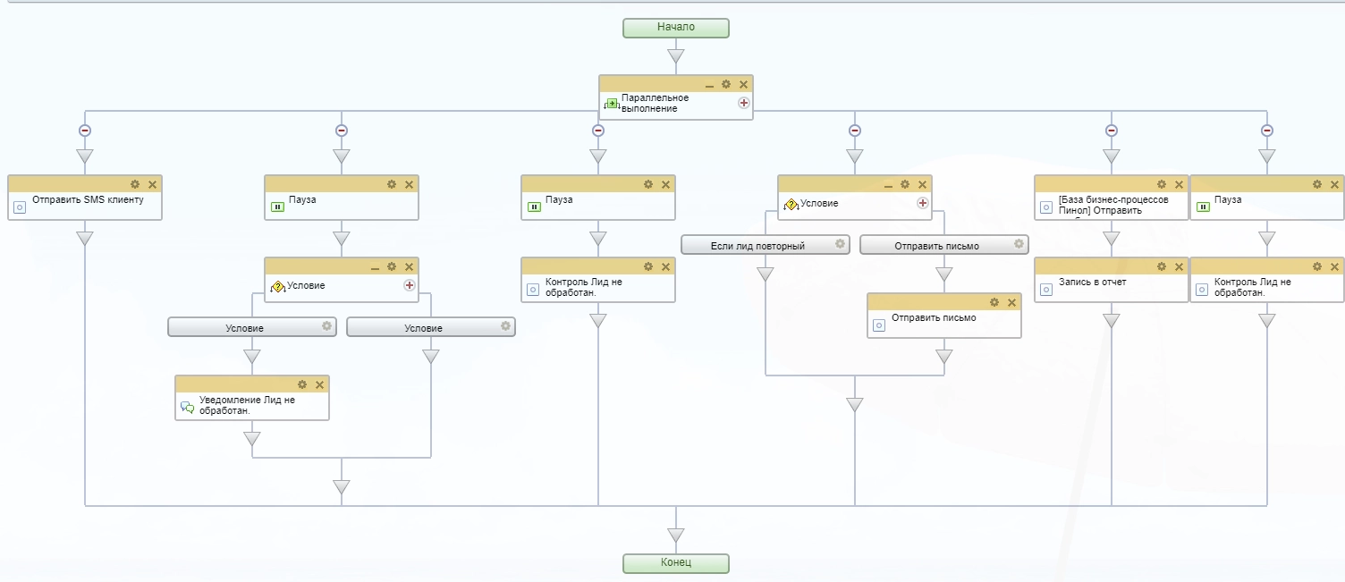 При появлении новых лидов настроено автоматическое распределение по всем менеджерам на основании входящих писем. Данный БП реализован с помощью нашего приложения “База Бизнес-процессов Пинол-Pinall”, он проверяет наличие активных дел у менеджера и распределяет равномерно нагрузку.