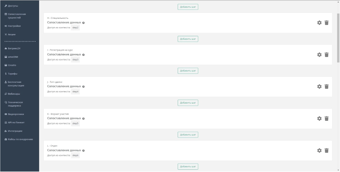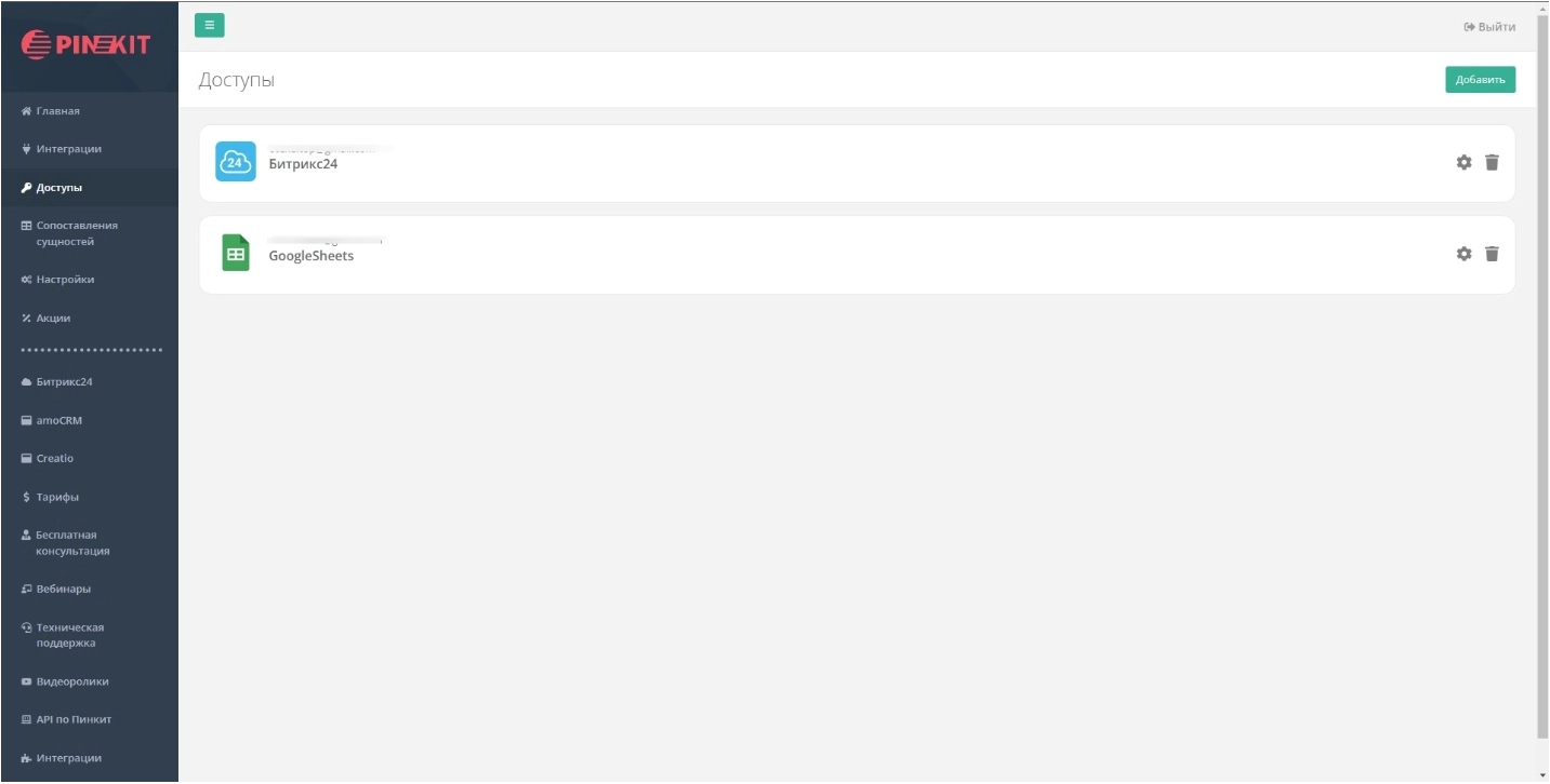 Клиентом были добавлены доступы Пинкит к нужным сервисам. Далее мы настроили две необходимые интеграции для выгрузки данных из Битрикс24 в Google Sheets через платформу Пинкит:
