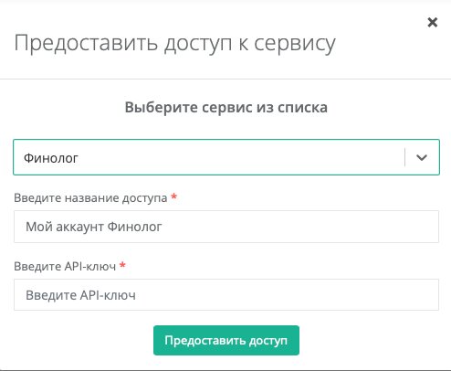 После регистрации (или авторизации) в Пинкит, переходим в раздел "Доступы", жмем кнопку "Добавить доступ" и выбираем в списке сервис Финолог: