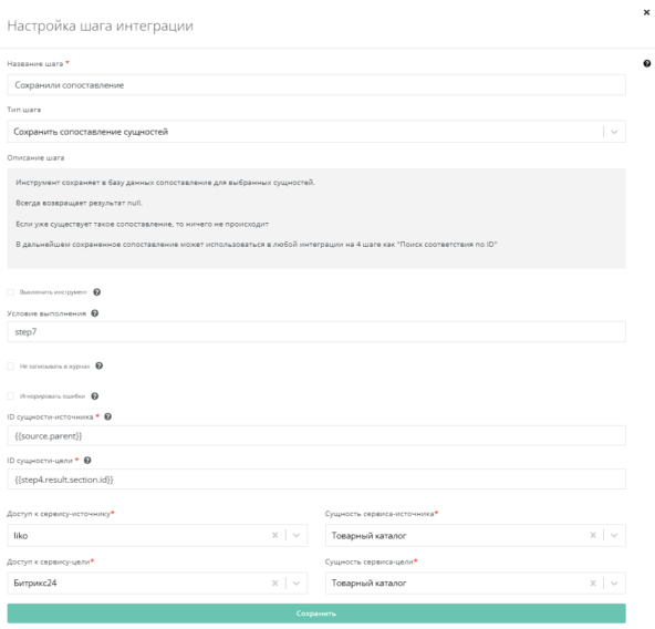 Используем инструмент Сохранить сопоставление сущностей. Условие выполнения - step7. ID сущности-источника - {{source.parent}}. ID сущности-цели - {{step4.result.section.id}}. Сопоставляем каталоги.