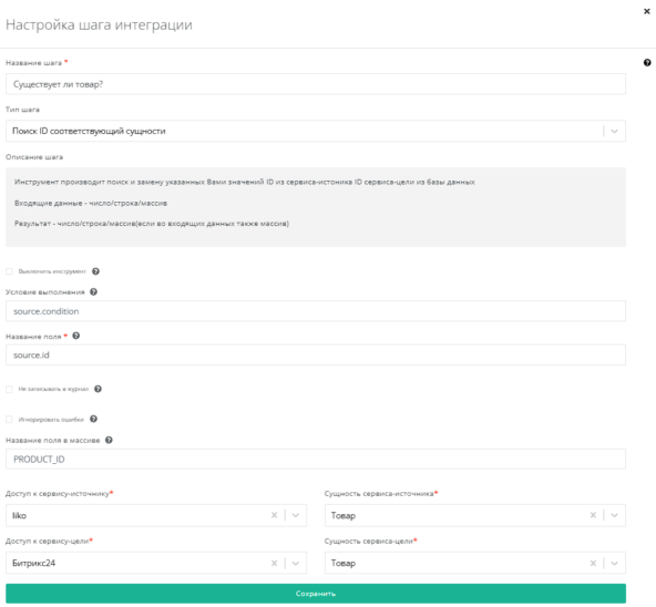 Используем Поиск ID соответствующий сущности в поле source.id. Сопоставляем сущности товаров.