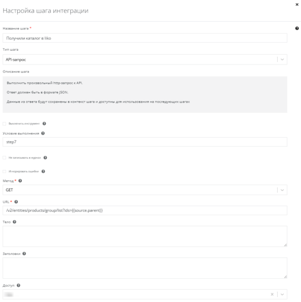 Используем API-запрос методом GET. Условие выполнения - step7. URL = /v2/entities/products/group/list?ids={{source.parent}}.