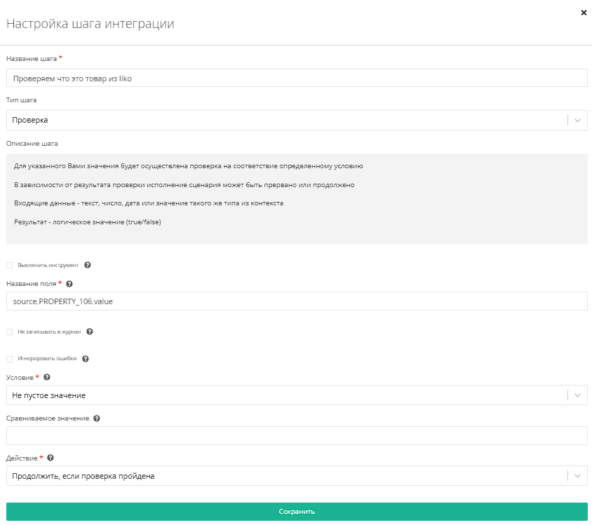 Используем инструмент Проверка в поле source.PROPERTY_106.value.