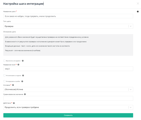 Используем проверку в поле step3. Условие - (Логическое) Истина, Действие - Продолжить, если проверка пройдена.