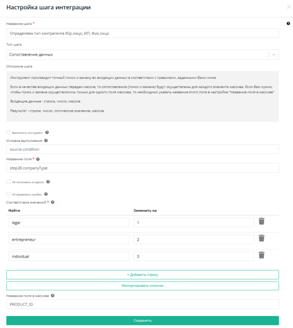 Используем Сопоставление данных в поле step19.0.value.name. Условие выполнения - step19. Сопоставляем метод оплаты.