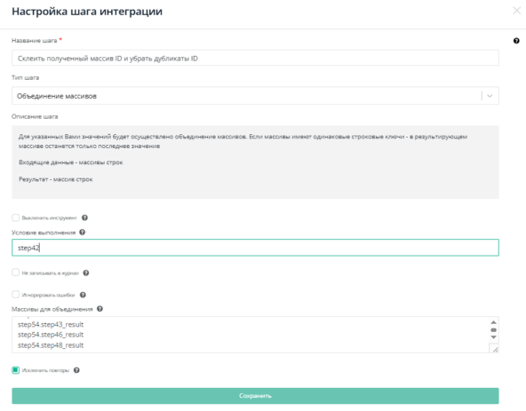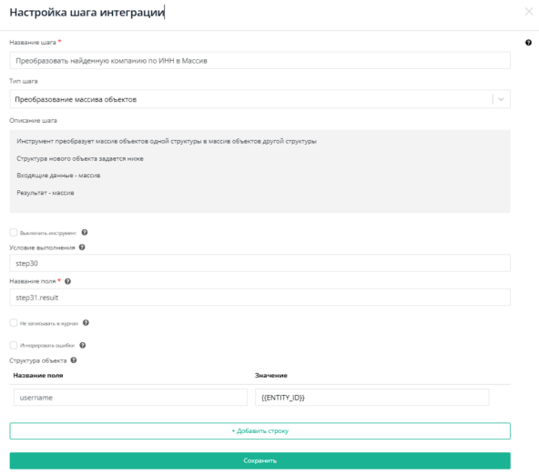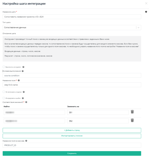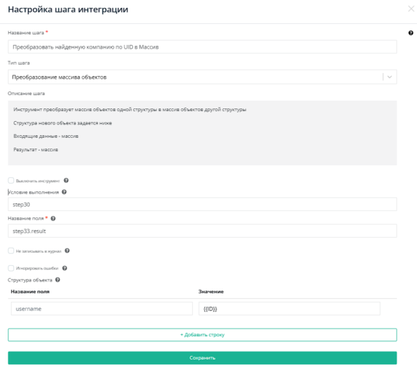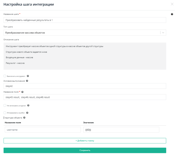 Используем Преобразование массива объектов в поле step43.result, step46.result, step48.result.