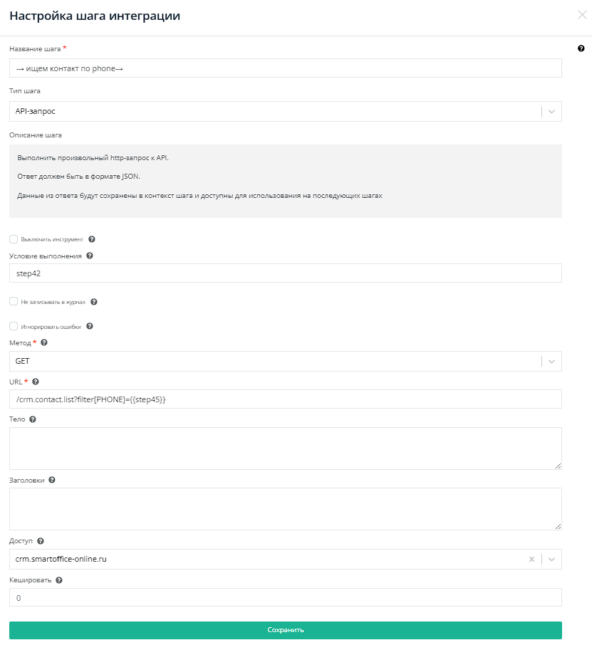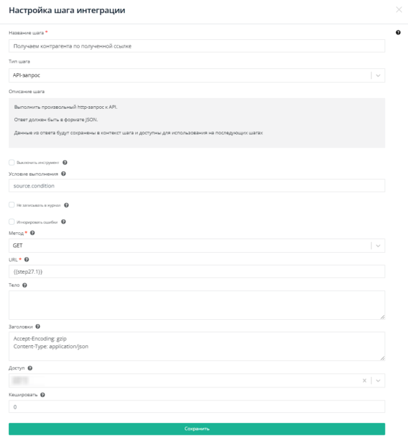 Используем API-запрос Методом GET с указанием URL = {{step56.1}}.