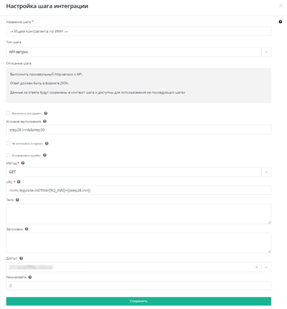 Используем API-запрос Методом GET с указанием URL = /crm.requisite.list?filter[RQ_INN]={{step28.inn}}.