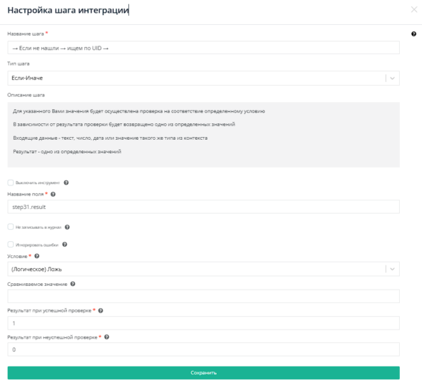 Используем инструмент Если-иначе в поле step31.result. Условие*(Логическое) Ложь, Результат при успешной проверке = 1, Результат при неуспешной проверке = 0.