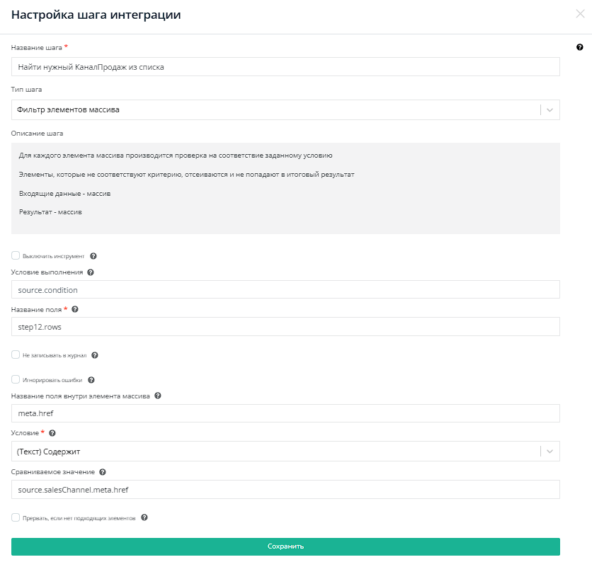 Используем Фильтр элементов массива в поле step12.rows. Условие*(Текст) Содержит, Сравниваемое значение = source.salesChannel.meta.href.