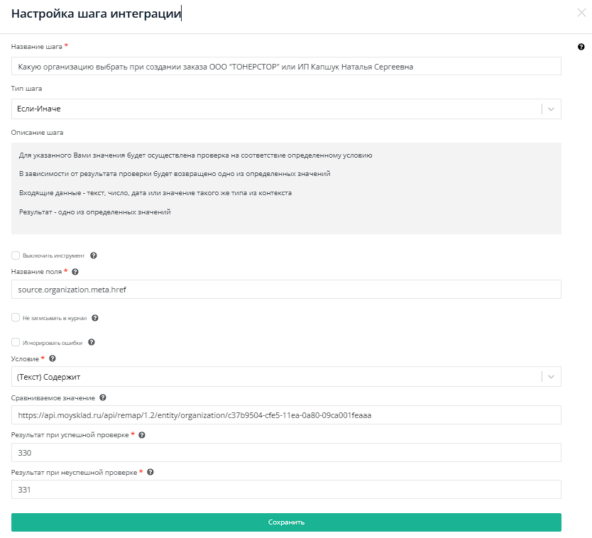 Используем инструмент Если-иначе в поле source.organization.meta.href. Условие*(Текст) Содержит, Сравниваемое значение - api.moysklad.ru/api/remap/1.2/entity/organization/c37b9504-cfe5-11ea-0a80-09ca001feaaa, Результат при успешной проверке = 330, Результат при неуспешной проверке = 331.