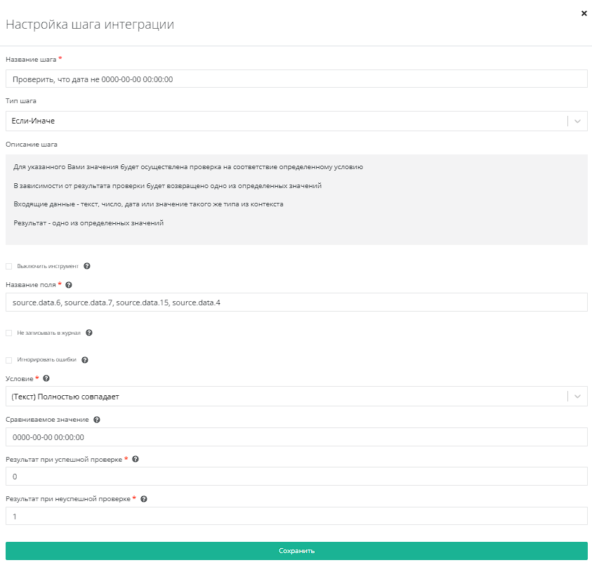 Используем тип шага Если-Иначе в полях source.data.6, source.data.7, source.data.15, source.data.4. Условие - (Текст) Полностью совпадает, Сравниваемое значение - 0000-00-00 00:00:00, Результат при успешной проверке = 0, Результат при неуспешной проверке = 1.