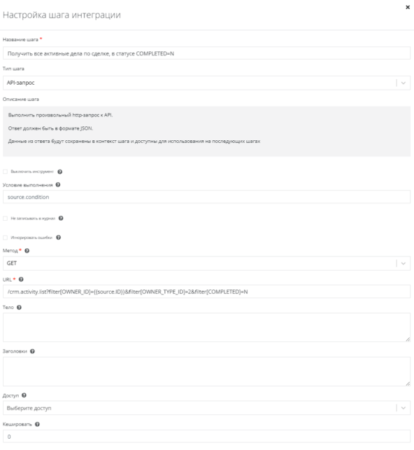 Добавляем API-запрос методом GET с указанием URL = /crm.activity.list?filter[OWNER_ID]={{source.ID}}&filter[OWNER_TYPE_ID]=2&filter[COMPLETED]=N.