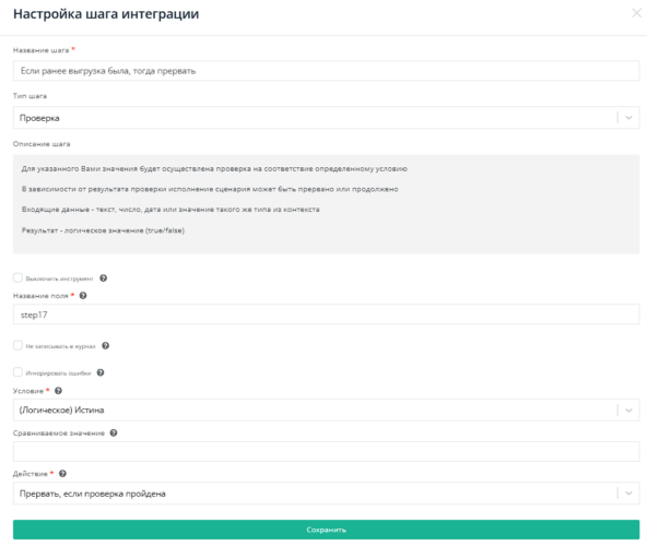 Используем проверку в поле step17. Условие - (Логическое) Истина, Действие - Прервать, если проверка пройдена.