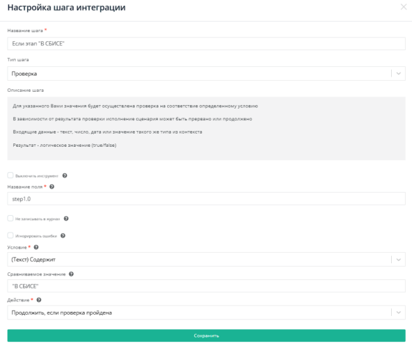 Используем проверку в поле step1.0. Условие - (Текст) Содержит, Действие - Продолжить, если проверка пройдена, Сравниваемое значение - "В СБИСЕ".