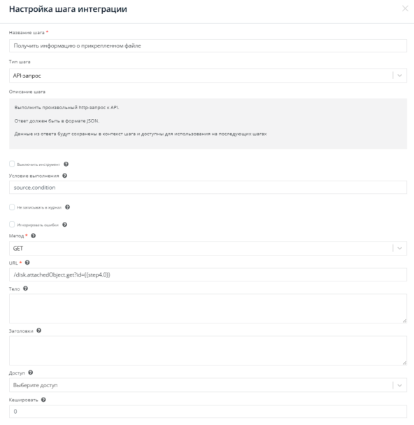 Используем API-запрос методом GET с указанием урла /disk.attachedObject.get?id={{step4.0}}.