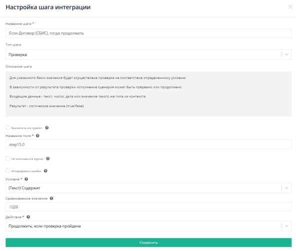 Используем проверку в поле step15.0. Условие - (Текст) Содержит, Сравниваемое значение - 1029, Действие - Продолжить, если проверка пройдена.