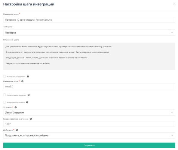 Используем проверку в поле step9.0. Условие - (Текст) Содержит, Сравниваемое значение - 1007 (идентификатор нужной организации), Действие - Продолжить, если проверка пройдена.