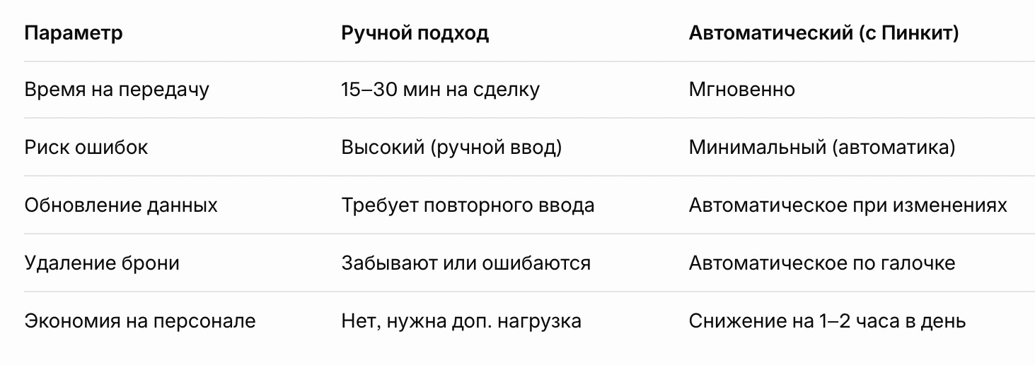 - Отмена сделки = еще одно ручное действие — удаление брони.