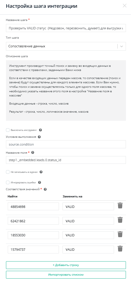 Используем инструмент Сопоставление данных. Сопоставляем статусы сделок (Недозвон, перезвонить, думает).