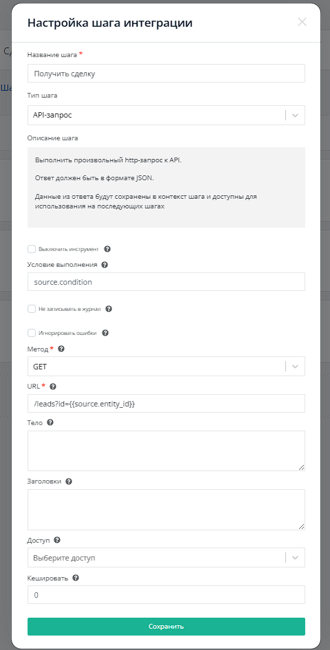Используем API-запрос Методом GET с указанием URL = /leads?id={{source.entity_id}}.