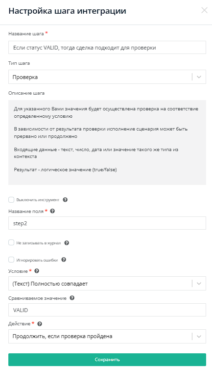 Используем инструмент Проверка по полю step2. Условие - (Текст) Полностью совпадает, Сравниваемое значение = VALID, Действие - Продолжить, если проверка пройдена.
