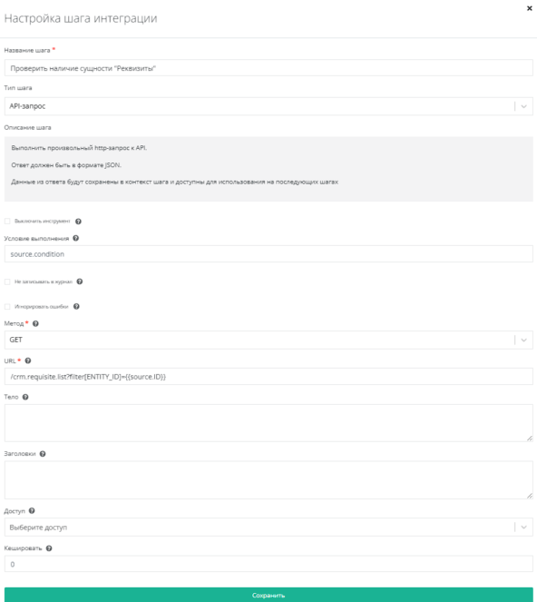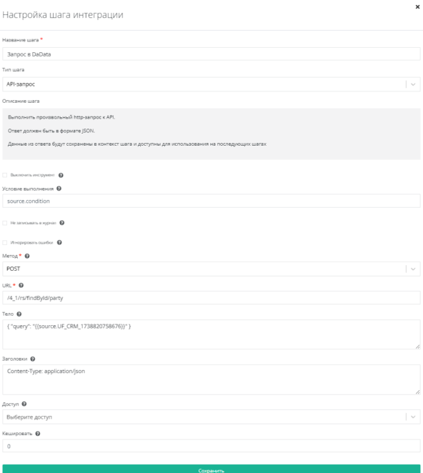 Тело запроса: { "query": "{{source.UF_CRM_1738820758676}}" }