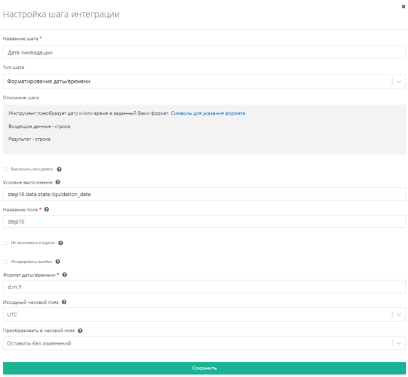 Используем Форматирование даты/времени в поле step10. Условие выполнения - step16.data.state.liquidation_date. Формат даты/времени - d.m.Y.