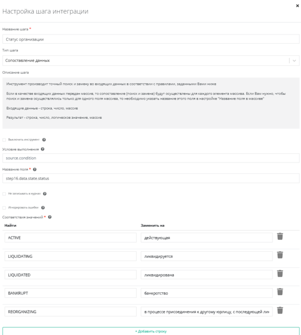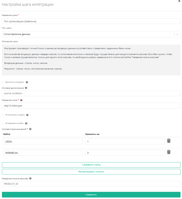 Используем инструмент Сопоставление данных по полю step16.data.type. Сопоставляем типы организаций.