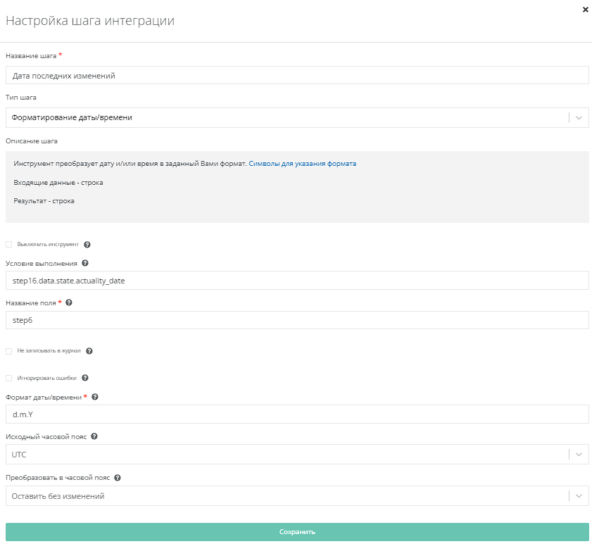 Используем форматирование даты/времени в поле step6. Условие выполнения - step16.data.state.actuality_date. Укажем формат даты d.m.Y.