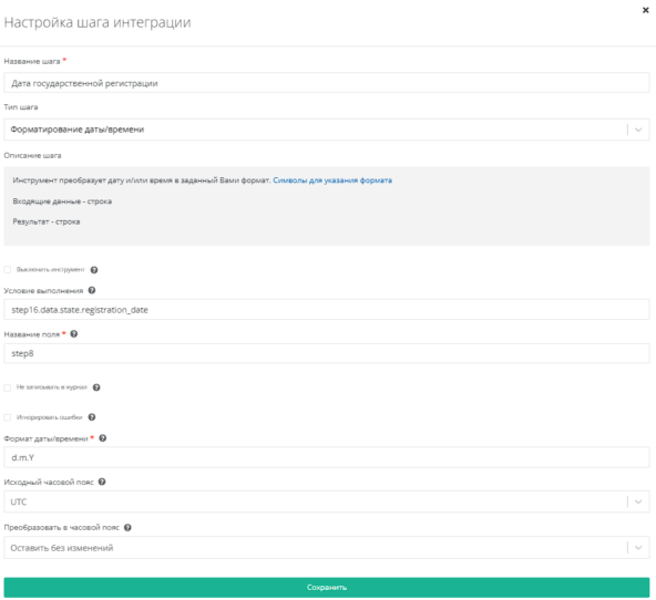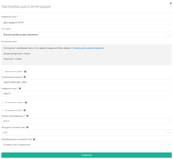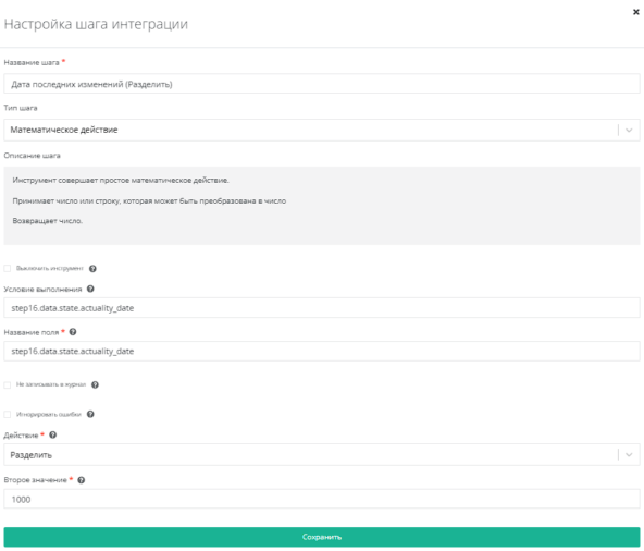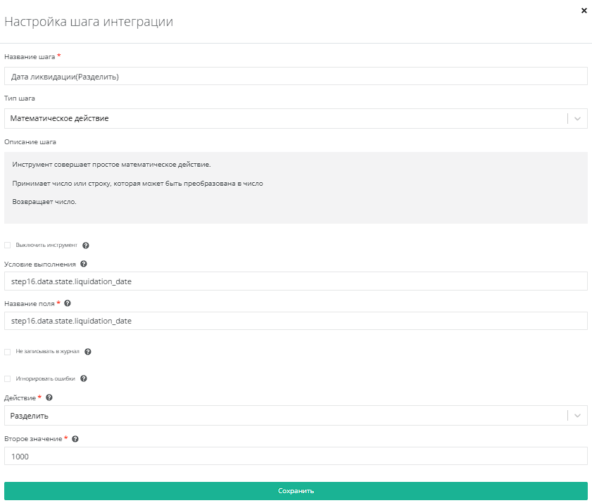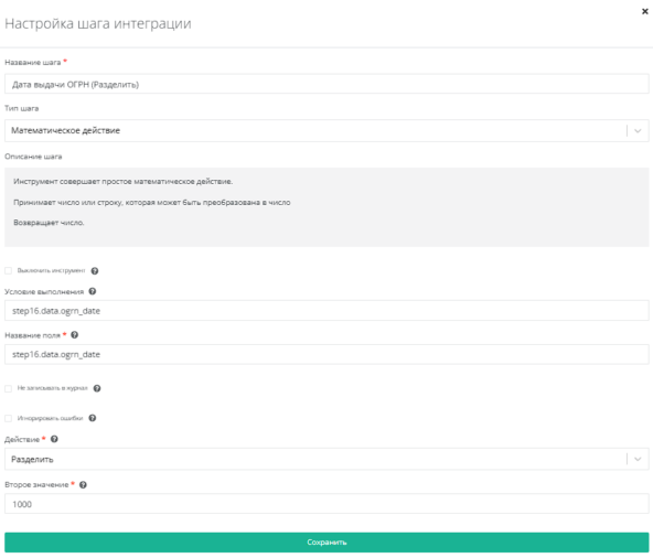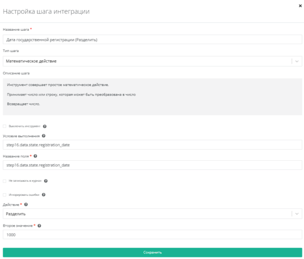 Используем Математическое действие с полем step16.data.ogrn_date. Условие выполнения step16.data.ogrn_date. Делим на 1000:
