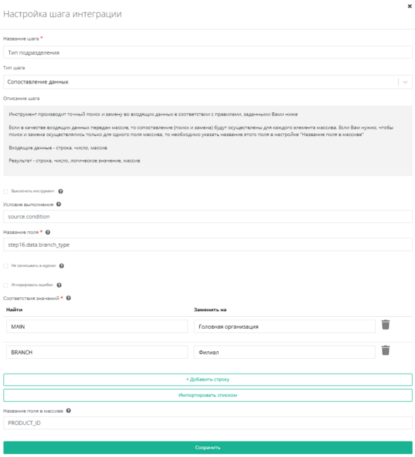 Используем инструмент Сопоставление данных по полю step16.data.branch_type. Сопоставляем типы подразделений.