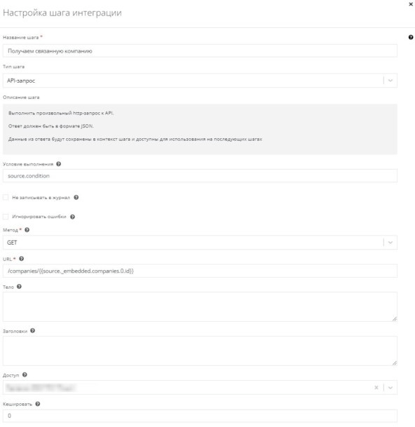 Используем API-запрос методом GET с указанием URL /companies/{{source._embedded.companies.0.id}}: